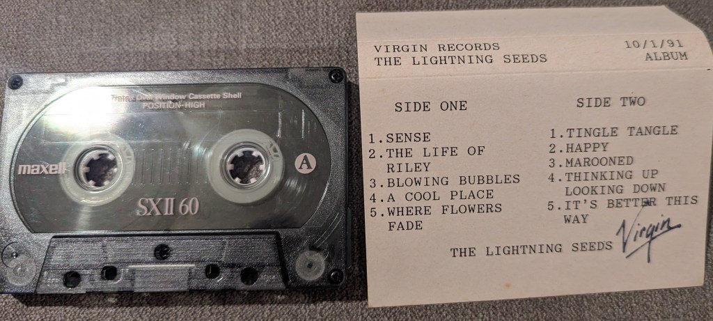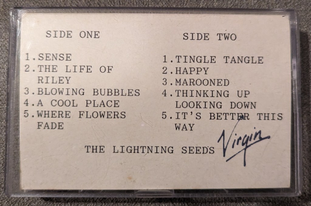 So, how did I end up with it? Well, there was a record shop in Falmouth once upon a time, which every couple of weeks had a stall at a flea market in the back (or front, depending on what side of the building you entered) of the Hall For Cornwall in Truro. At that point I worked for the local newspaper’s website department in Truro and would take a wander across during my lunch breaks. Got to know the lady that ran the stall reasonably well, and before too long she would hold back items by the Lightning Seeds, Crowded House and World Party for me before she put them up for general sale. I popped in one day and immediately she told me “I’ve got something Lightning Seedsy for you” and showed me the cassette. I had my wallet out before you could say “my best day”. Didn’t take a whole lot of notice of the track listing as I had to go back to work, but was looking forward to playing the tape when I got home in case there were any different versions of songs. Got home, saw the track listing, popped my eyes back into their sockets and assumed it was a misprint. Played the tape in full, and it got to the final track. Oh my goodness, what was this? Scroll down after you’ve read the rest of my waffle to find out exactly what it is.