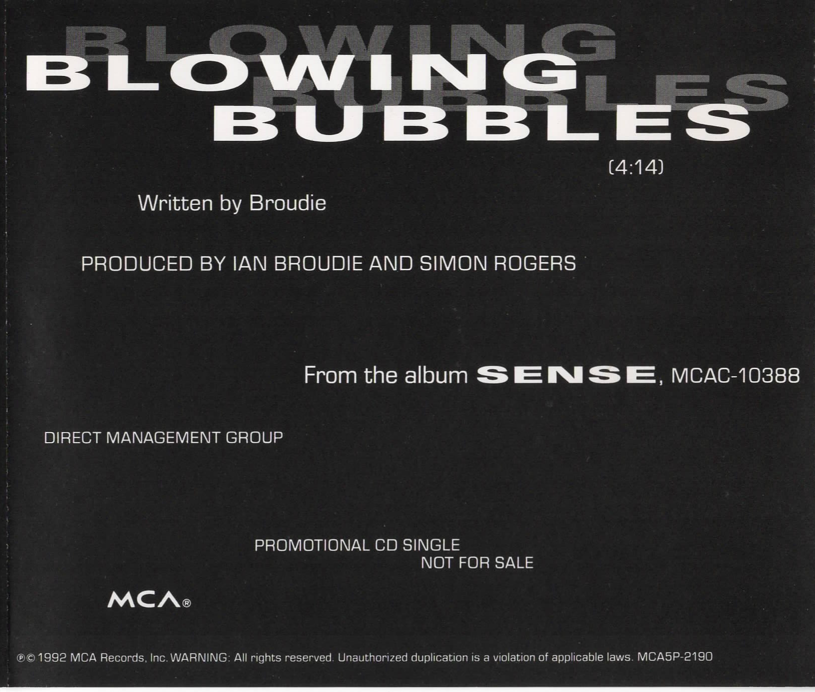 The Life of Riley and Sense were released as singles across the globe. The UK and everywhere else had singles distributed through Virgin Records after Ghetto got sold. The USA was no different, however, MCA released both singles with slightly different track listings (we’ll cover those in other issues) and, unlike the UK and the rest of the world, felt the need to add a third single to the discography. Globally, The Life of Riley was the lead single from the album and Sense was the second single. However, over in the States, MCA Records released Blowing Bubbles as a single in between The Life of Riley and Sense.
